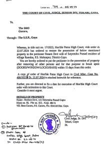 गुरारू,गया, बिहार (संज्ञान न्यूज) माननीय उच्च न्यायालय पटना के आदेश का पालन करते हुए व्यवहार न्यायालय, टेकारी ने विविध वाद संख्या 496/23 दिनांक 22.07.2024 के आदेश के प्रति उच्च न्यायालय के आदेश पर व्यवहार न्यायालय के द्वारा वरीय पुलिस अधीक्षक महोदय गया को निर्देशित किया गया कि दुकान के वास्तविक मालिक रेशम देवि पति सत्येंद्र प्रसाद गुप्ता को कब्जा बहाल कर हर संभव सहयोग सुनिश्चित करें।