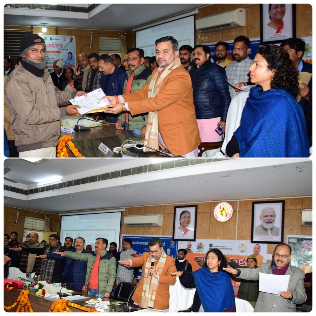 कलेक्ट्रेट सभागार में स्वामित्व योजना के कार्यक्रम के दौरान मुख्य अतिथि सदस्य, विधान परिषद अनूप गुप्ता ने उपस्थित जनप्रतिनिधियों, पार्टी पदाधिकारियों, जिला स्तरीय अफसरों, बड़ी संख्या में मौजूद लाभार्थियों को क्रमशः स्वच्छता और नशा उन्मूलन की शपथ और संकल्प दिलाया।