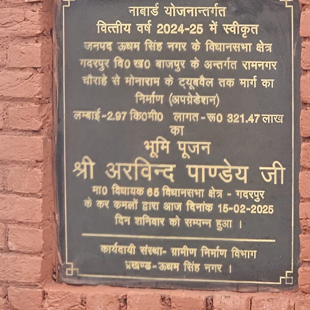 प्राप्त जानकारी अनुसार केलाखेड़ा के निकट ग्राम रामनगर से निकटवर्ती ग्राम टांडा खेम तक सड़क मार्ग जो कि पिछले कई दशकों से जर्जर हो चुका था जिसके लिए क्षेत्रीय लोगों द्वारा विधायक अरविंद पांडे के समक्ष मार्ग के पुनर्निर्माण की मांग कई बार उठाई जा चुकी थी। विधायक अरविंद पांडे द्वारा शासन स्तर पर नाबार्ड योजना के अंतर्गत 321.47 लाख रुपए की धनराशि स्वीकृत कराई गई जिसके अंतर्गत मार्ग के निर्माण हेतु आज भूमि पूजन किया गया भूमि पूजन के पश्चात एक जनसभा का आयोजन भी किया गया जिसमें स्थानीय लोगों द्वारा क्षेत्रीय विधायक का माल्यार्पण कर आभार व्यक्त किया गया जनसभा में मौजूद लोगों को संबोधित करते हुए क्षेत्र विधायक ने कहा कि उनके द्वारा क्षेत्र की जनता की मांग को शासन स्तर पर उठाया गया जिसमें थोड़ा विलंब तो हुआ परंतु उत्तराखंड के मुख्यमंत्री द्वारा उनकी मांग पर नाबार्ड योजना के अंतर्गत धनराशि स्वीकृत की गई कार्य प्रारंभ हो चुका है अब क्षेत्रीय जनता की जिम्मेदारी बनती है कि वह स्वयं इस मार्ग का निर्माण अपनी देखरेख में कराएं, इस अवसर पर क्षेत्रीय विधायक ने कहा कि आज विश्व पटल पर भारतवर्ष की छवि प्रधानमंत्री नरेंद्र मोदी जी के नेतृत्व में अलग ही बन चुकी है कभी समय ताकि भारत के प्रधानमंत्री को अमेरिका के राष्ट्रपति से मिलने के लिए समय ही नहीं मिल पाता था परंतु वर्तमान में विश्व के प्रथम देश अमेरिका का राष्ट्रपति भी हमारे प्रधानमंत्री के सम्मान में स्वयं खड़ा होता है इसी प्रकार आम जनता की जन समस्याओं का भी निराकरण प्रधानमंत्री मोदी जी छोटे से छोटे स्तर पर कर रहे हैं, इस अवसर पर भाजपा मंडल अध्यक्ष महेंद्र कालरा,किसान मोर्चा उपाध्यक्ष रमेश चंद्र, उदय पाल मण्डल उपाध्यक्ष, अजय शर्मा (मामा जी), जितेंद्र चान्ना,बैअंत सिंह अध्य्क्ष प्रेस क्लब, पंजाराम कम्बोज, मोनाराम, फोजाराम, जनराम, बलविंदर कुमार, रक्षपाल सिंह पत्रकार , रिंकू सिंह पत्रकार,मलकीत कम्बोज आदि लोग प्रमुख रूप से मौजूद रहे।